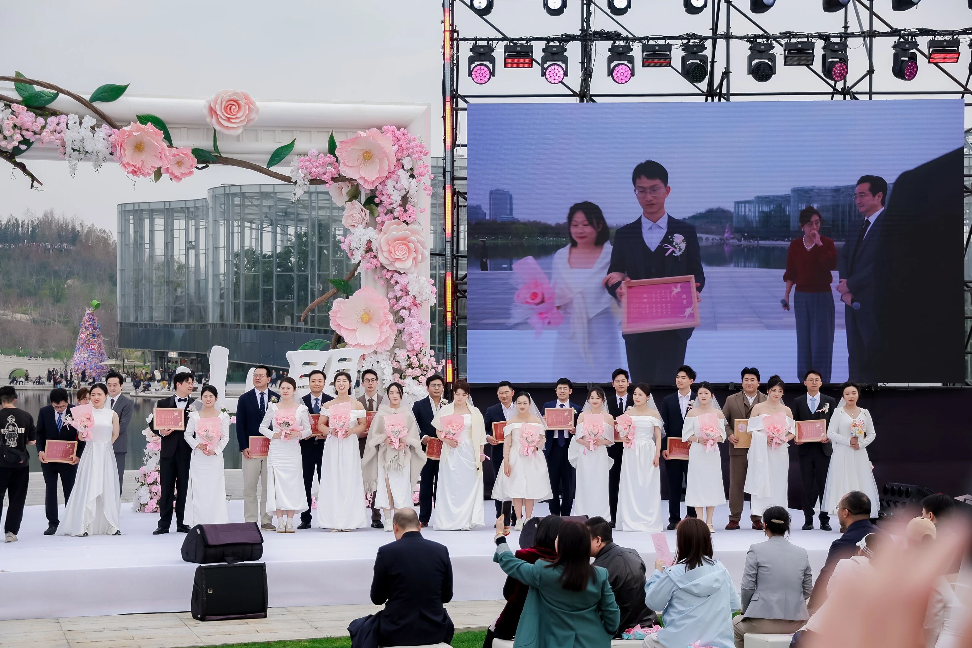音乐渐止,百对新人分为四组依次登台,在“爱情见证官”的陪伴下领取婚书。每组新人走上舞台,台下便响起热烈掌声,亲友们纷纷举起手机,记录下这一珍贵时刻。