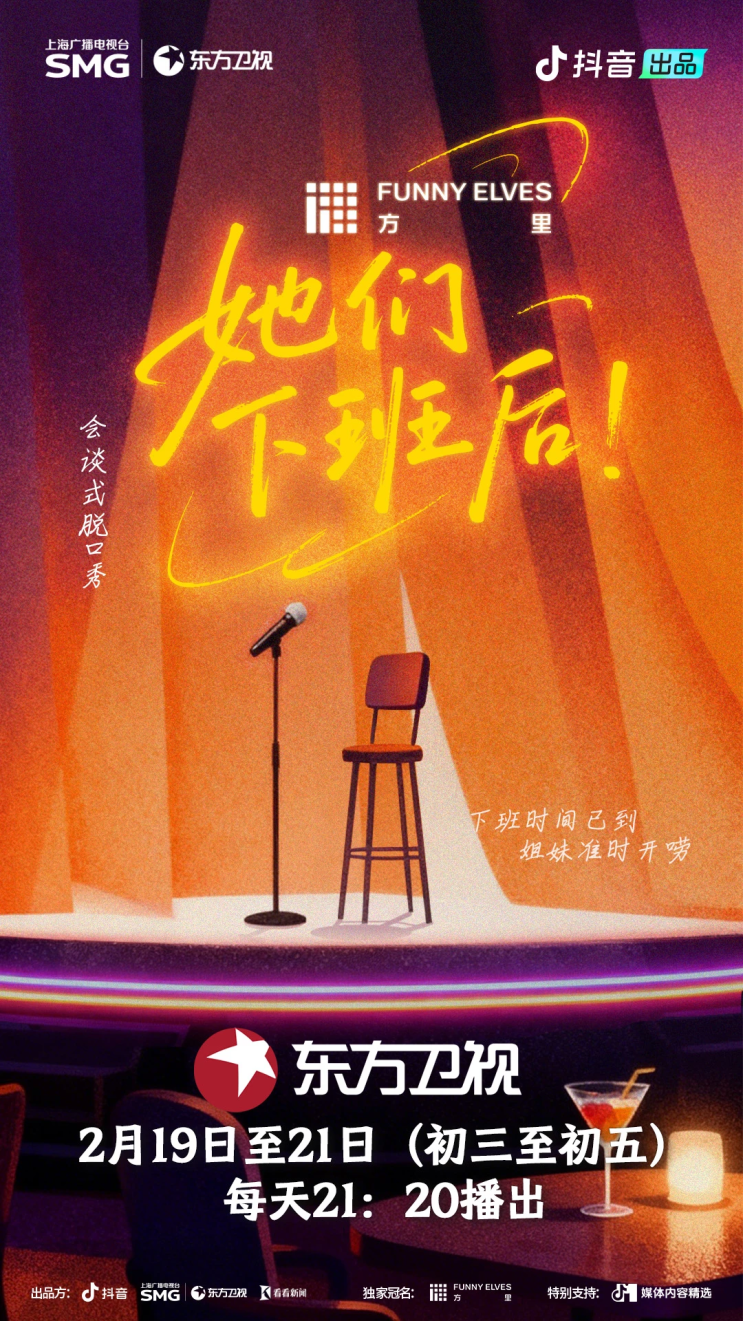 与抖音平台合作的全新综艺脱口秀《她们下班后》聚焦年轻职场人的压力与快乐,彰显海派喜剧特色。