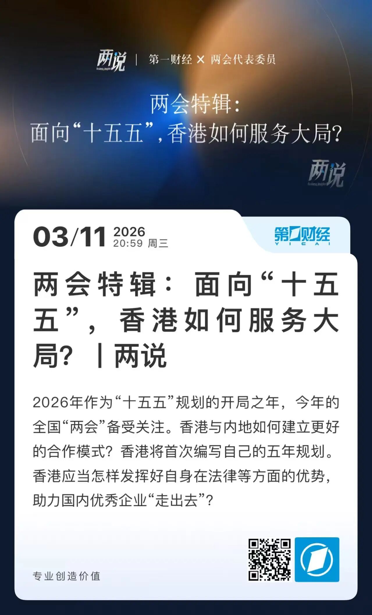 东方卫视、第一财经《两说》3月11日制作播出“两会特辑”《面向“十五五”,香港如何服务大局?》,报道两会期间香港特别行政区全国政协委员庄紫祥、人大代表黄英豪、陈晓峰围绕“十五五”开局的建言献策。代表委员们一致认为,香港应抓住首次编制五年规划的契机,发挥“超级联系人”作用,通过“北科技、南金融”布局,助力内地企业“拼船出海”与资本“东移”,在融入国家大局中实现共赢。