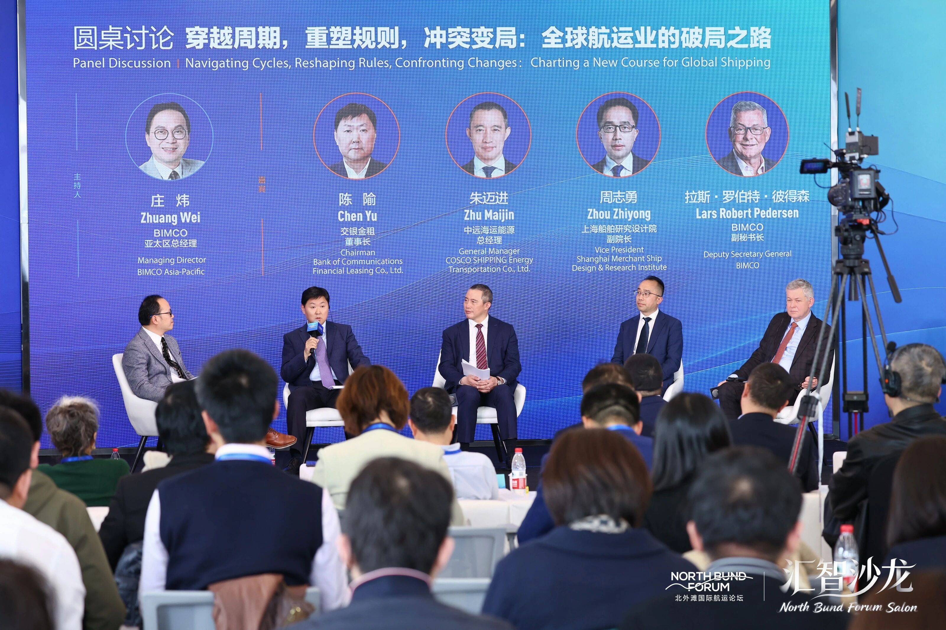 现场沙龙环节,BIMCO亚太区总经理庄炜对话交银金融租赁有限公司董事长陈隃、中远海运能源运输股份有限公司总经理朱迈进、上海船舶研究设计院副院长周志勇、BIMCO副秘书长拉斯•罗伯特•彼得森。五位嘉宾围绕“穿越周期,重塑规则,冲突变局:全球航运业的破局之路”这一话题,就地缘政治风险、金融支撑与绿色转型展开深度对话。