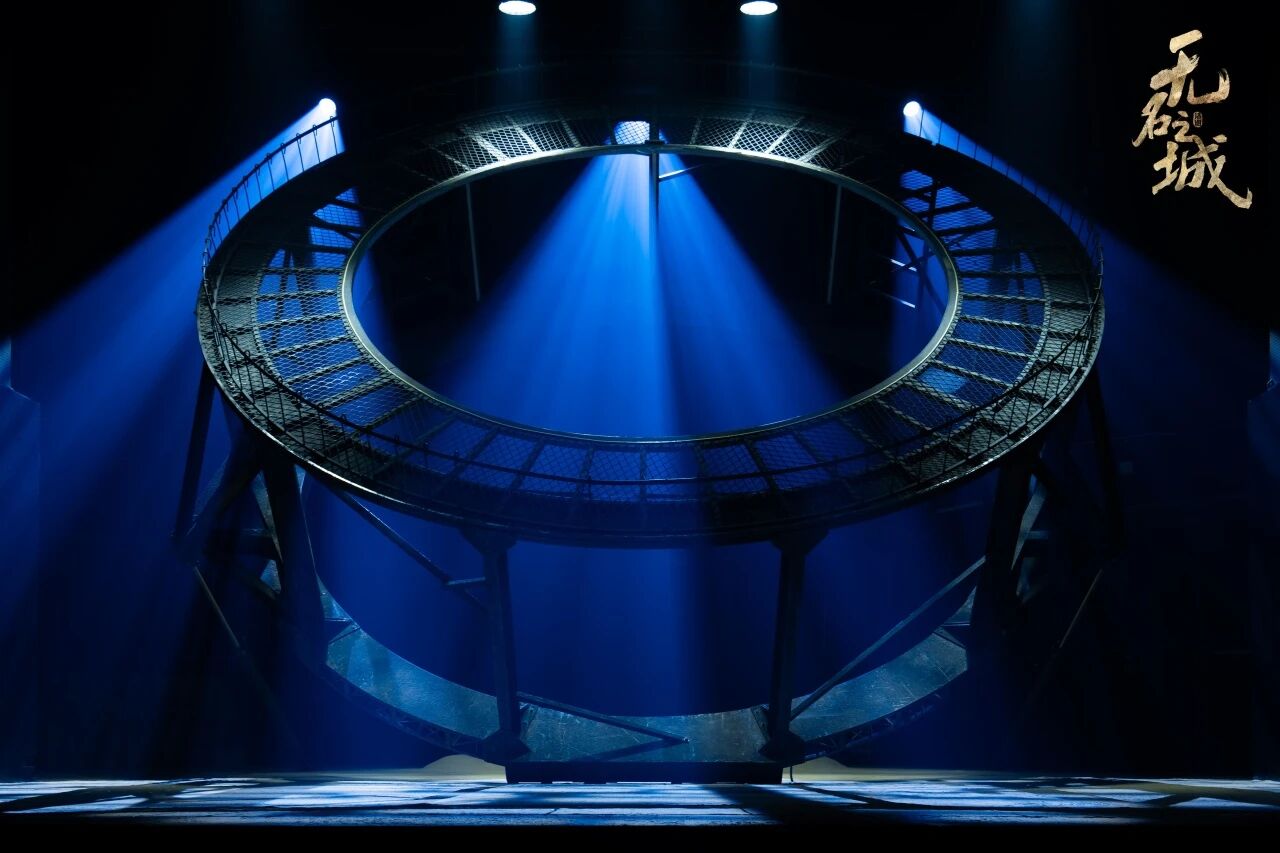 舞美设计灵感来源于原子弹实验核反应堆的空间感——舞台中央是一个极简练的铁质框架式桶状结构。在剧情推动下,这个巨大的框架结构随之变化,时而是科研实验室,时而是核城动物园,时而又变成了防空洞……
