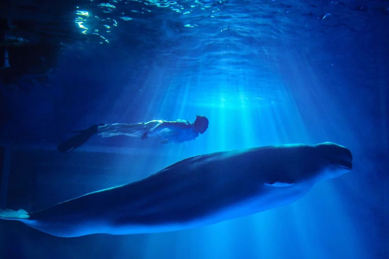 梦幻水舞秀《鱼•悦》取材于在临港发生的真实事件——一尾幼年蓝鲸搁浅于临港的海滩上,在当地市民的努力下,它被解救并放归东海。节目以“人鲸共舞”的形式,艺术化再现了人与蓝鲸无言却真切的交流。