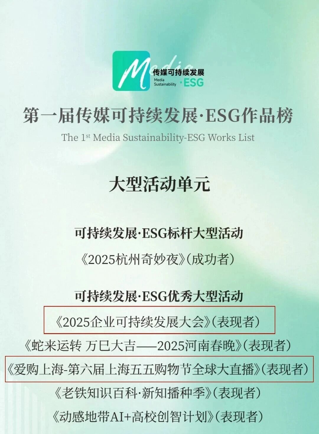 上海广播电视台(上海文广集团)创制出品的《2025企业可持续发展大会》《爱购上海——第六届上海五五购物节全球大直播》、舞剧电影《永不消逝的电波》、电视剧《蛮好的人生》、纪录片《一路前行》第二季,凭借在 ESG(环境、社会、治理)领域的突出实践,成功斩获大型活动单元、电影单元、剧集单元、综艺节目单元等在内的5个奖项。旗下东方明珠新媒体股份有限公司进入可持续发展指数总榜TOP20及电视广播公司分榜TOP5,以“高阶探索者”评级展现文化消费传媒企业的可持续发展实力。