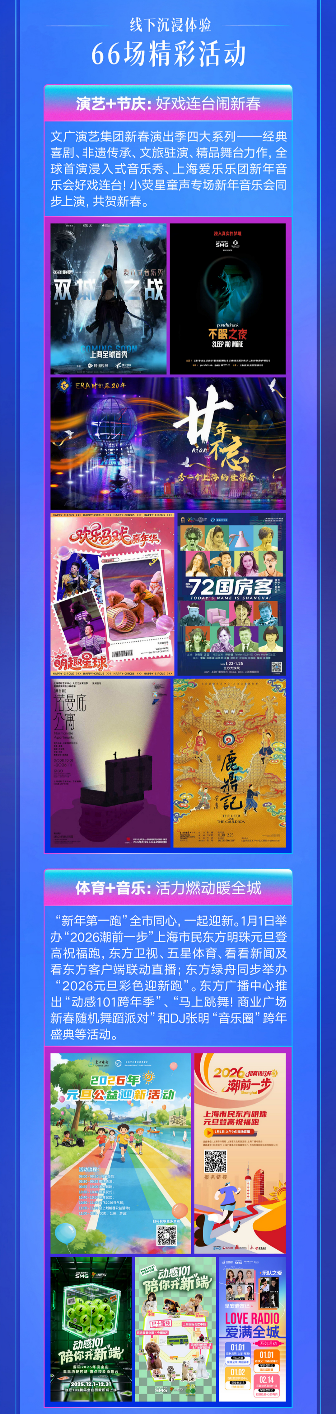 本次活动以“全媒体、多业态、都市型、国际化”为定位,以“大小屏协同赋能”为核心抓手,充分发挥上海广播电视台(集团)“链主”功能,整合旗下内容矩阵、线下演艺、文旅地标及台内外产业资源,精选推出66项优质项目,覆盖新年节目、经典IP、潮流体育、沉浸演艺等文化业态,以及教培、餐饮、酒店等生活服务领域,系统性打造迎新演出单、文旅打卡指南等内容产品。
