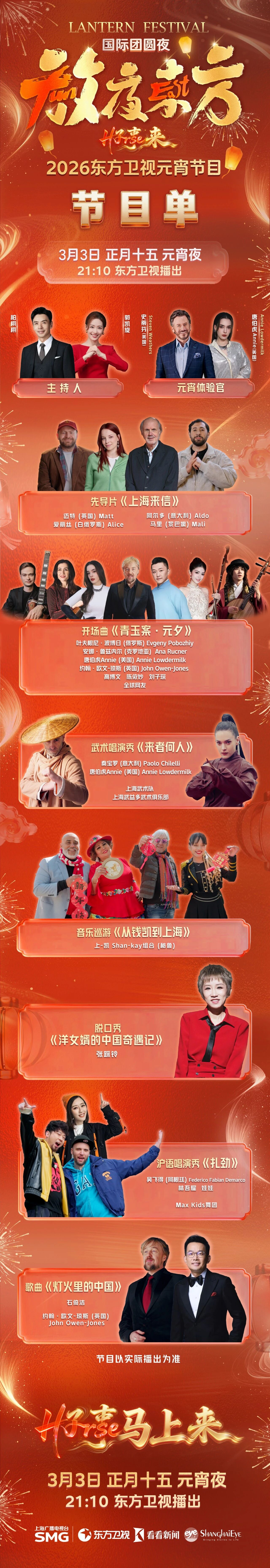 本次元宵节目以中外嘉宾联合创作、同台演绎为核心,多语言、多文化的碰撞共鸣贯穿全程:中西合奏、武术炸场、乐队巡游、脱口秀开麦、沪语Rap地道输出,中外两大男高音开口即封神……这不仅仅是一台晚会,更是一场跨越文化边界、连接世界友人的团圆盛宴。